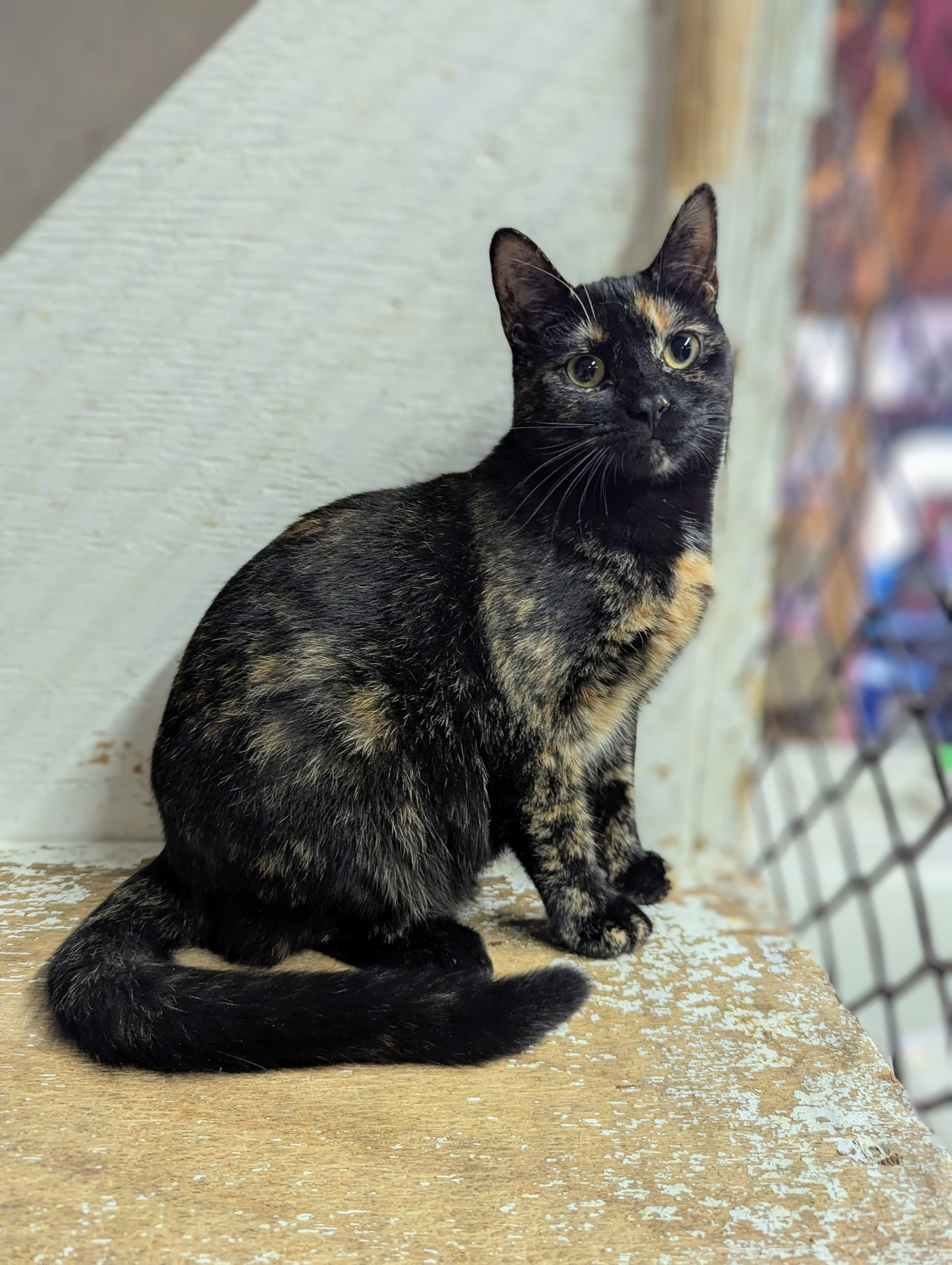 Joi is a beautiful young Tortie who was rescued from a large outdoor colony and is now safe, comfortable, and thriving in our shelter. She’s a playful sweetheart who loves chasing the laser light, enjoys pets, and is starting to let us pick her up for short periods of time. Joi would do best in a quiet home where she can continue her socialization at her own pace. She’d also thrive with another feline friend in the household. Joi gets along wonderfully with all the other shelter kitties and is ready to bring her gentle charm and affectionate nature to a forever home.