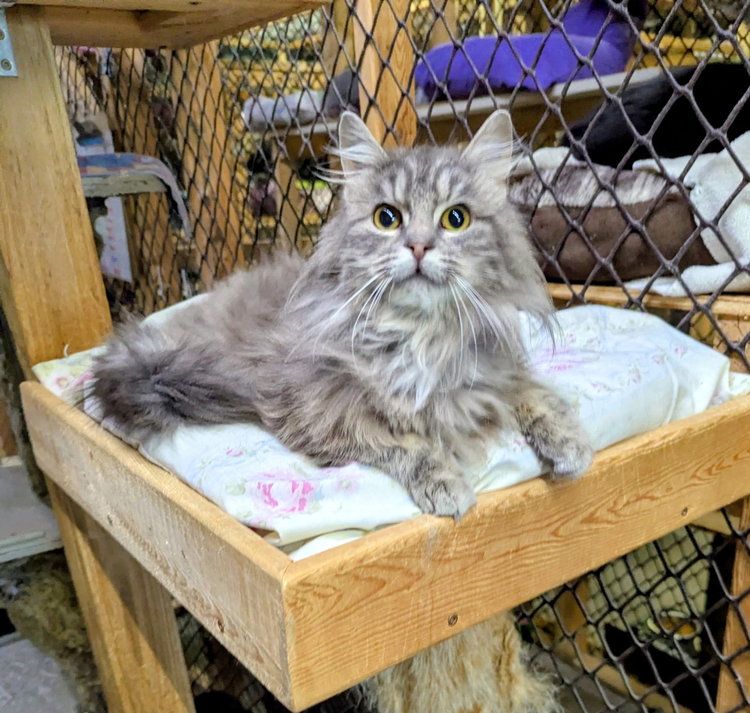 Meridith is a stunning long-haired beauty who came to us from a large outdoor colony, unsure of the world and wary of people. When she first arrived at the shelter, she was very scared and didn’t yet trust humans—but her journey since then has been truly heartwarming. With patience and care, Meridith has blossomed into a loving, affectionate girl who now craves human attention. She happily soaks up pets and enjoys spending time with people, showing just how far she’s come. Meridith gets along wonderfully with all the other shelter kitties and would thrive in a home with a feline friend to keep her company. She’s ready to leave her past behind and start her new life with a family who will continue to give her the love she now knows and deserves.
