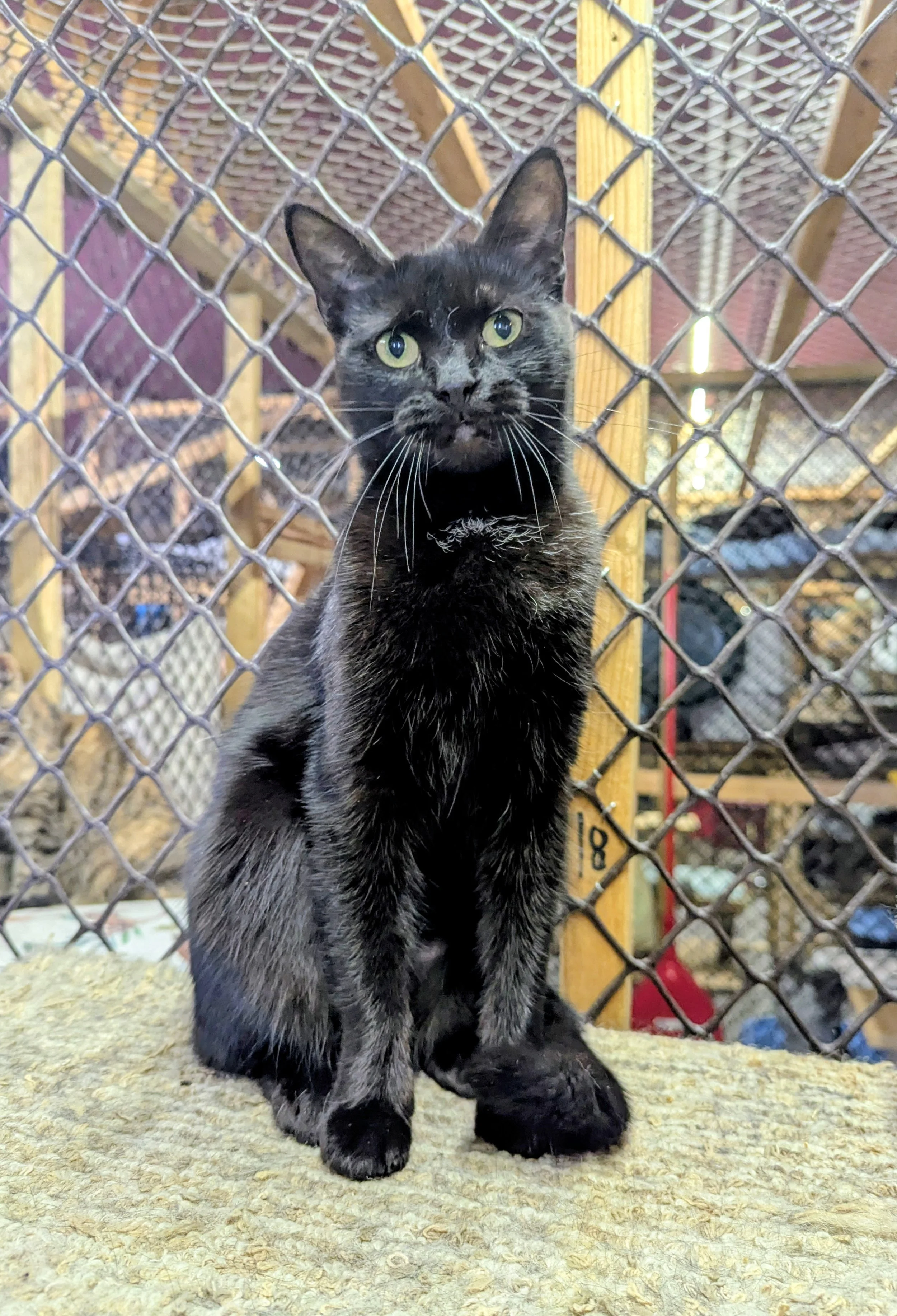 Kenia is a petite black beauty with a quiet strength that has blossomed into confidence. Rescued from a large colony of cats, she first arrived at our shelter in October 2024 feeling shy and unsure about the unfamiliar world around her. New sounds, new faces, and gentle hands were all a bit overwhelming at first. With time, patience, and plenty of love, Kenia began to realize she was safe. Day by day, her cautious glances turned into curious looks, and her hesitant steps became confident strides. Now, she happily roams our General Population, seeking out pets and soaking up attention from visitors. She especially enjoys gentle chin scratches and will lean in sweetly for more. Kenia’s journey from timid colony cat to affectionate companion has been truly heartwarming. She would thrive in just about any home — whether alongside another friendly feline or as the center of attention as your one and only. All she needs is a loving family to continue the happy chapter she’s just begun.