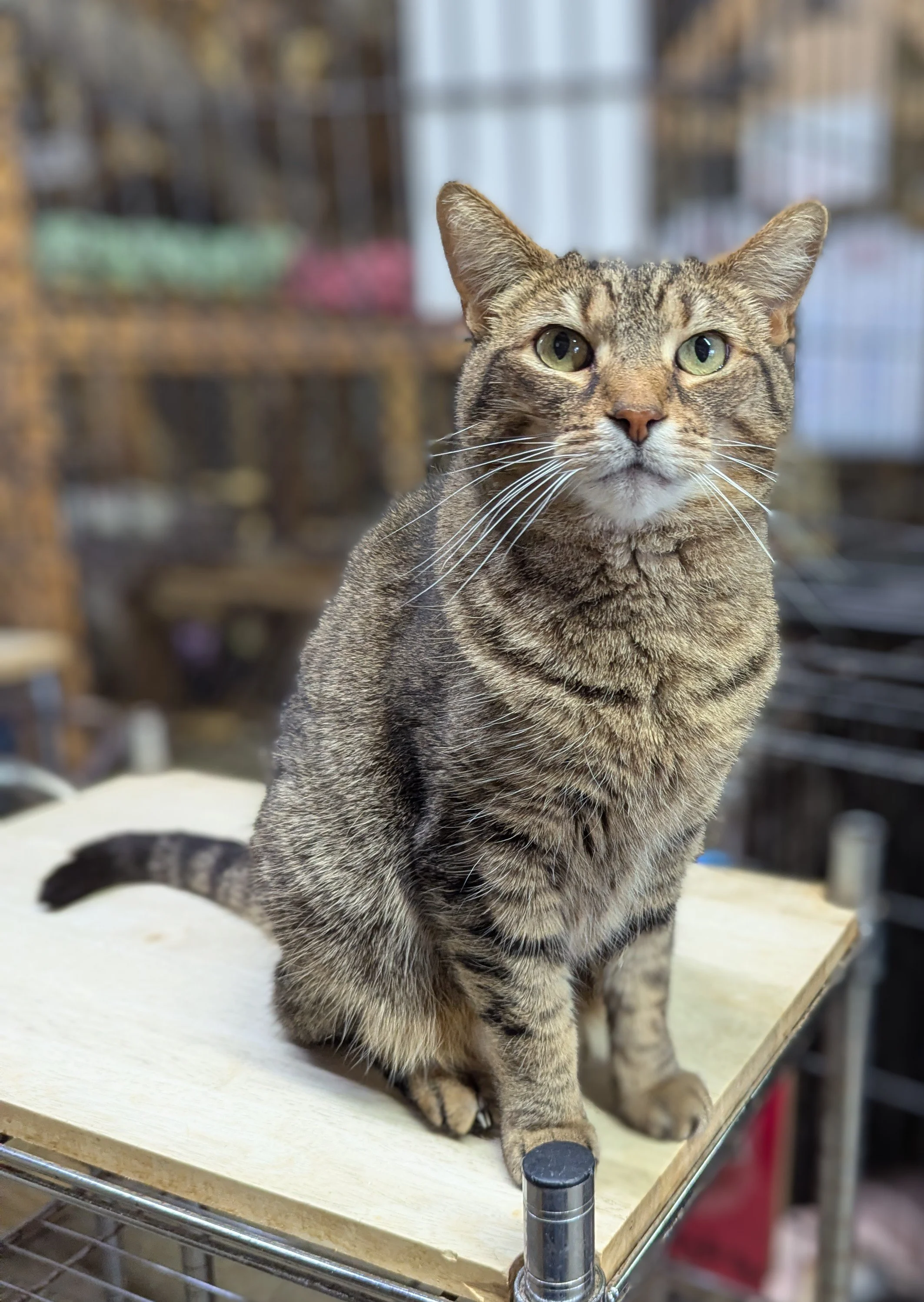 Nora is a beautiful brown tabby girl who is ready to find her forever home. With her striking tabby markings and gentle personality, Nora is sure to capture your heart. Life in the shelter has been a bit overwhelming for her with so many other kitties around, and she would much prefer a calmer space where she can truly relax. Nora dreams of being the queen of her castle in a home where she can soak up all the love and attention she craves. She absolutely adores human companionship and will happily spend her time by your side, enjoying pets and affection. If you’re looking for a loyal companion who will reward you with endless love, Nora might just be the perfect match.