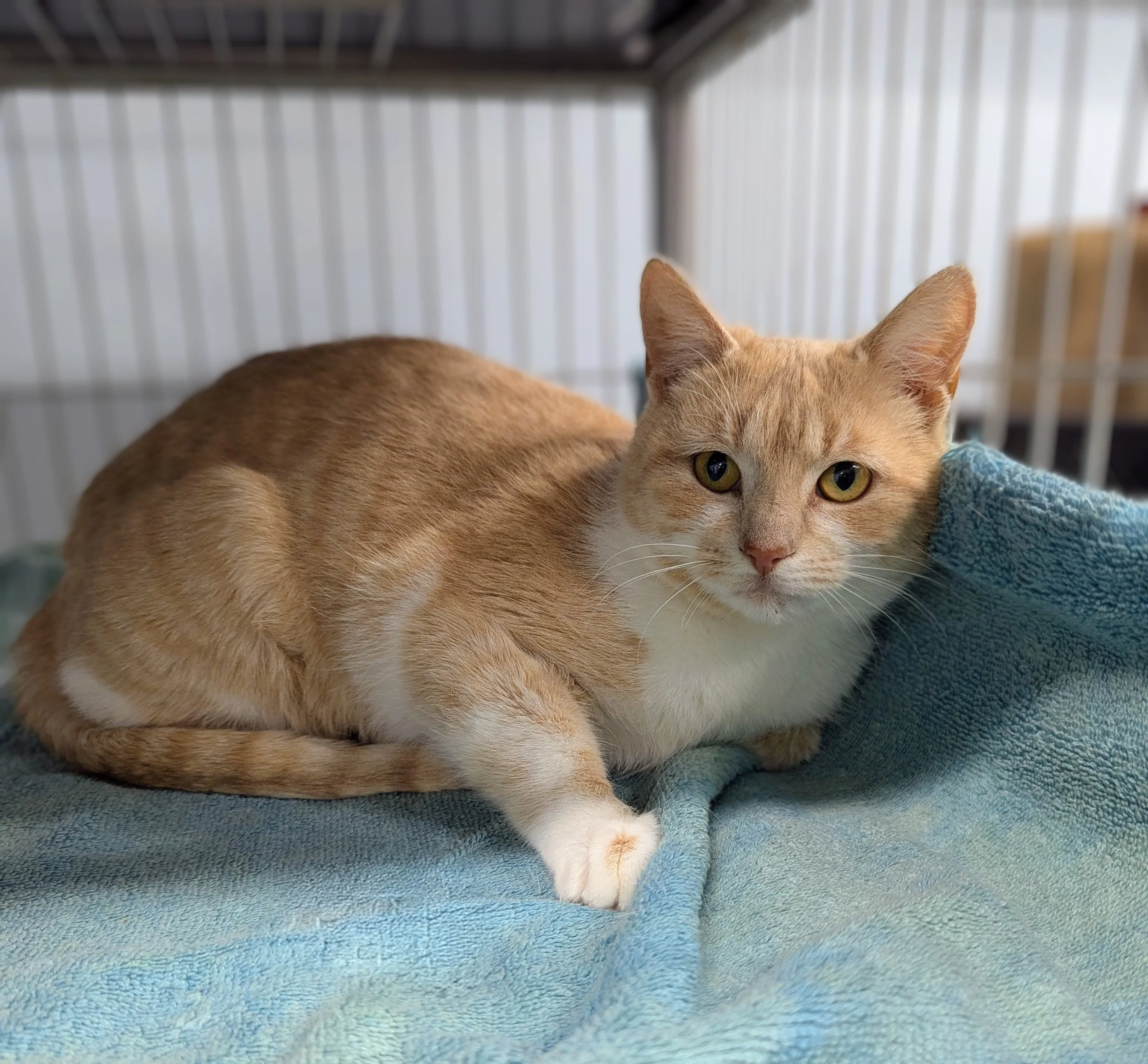 Bluebelle is a beautiful buff orange and white kitten with a gentle heart and a resilient spirit. Rescued by a caring Samaritan after bravely fending for herself outdoors, she’s now safe, warm, and thriving at the shelter. Despite her rough start, Bluebelle is incredibly affectionate—she starts purring and kneading the moment you give her a little attention, soaking up every bit of love she can get. This sweet girl is now waiting patiently for her forever family, ready to trade her past for a future full of comfort, care, and cuddles.