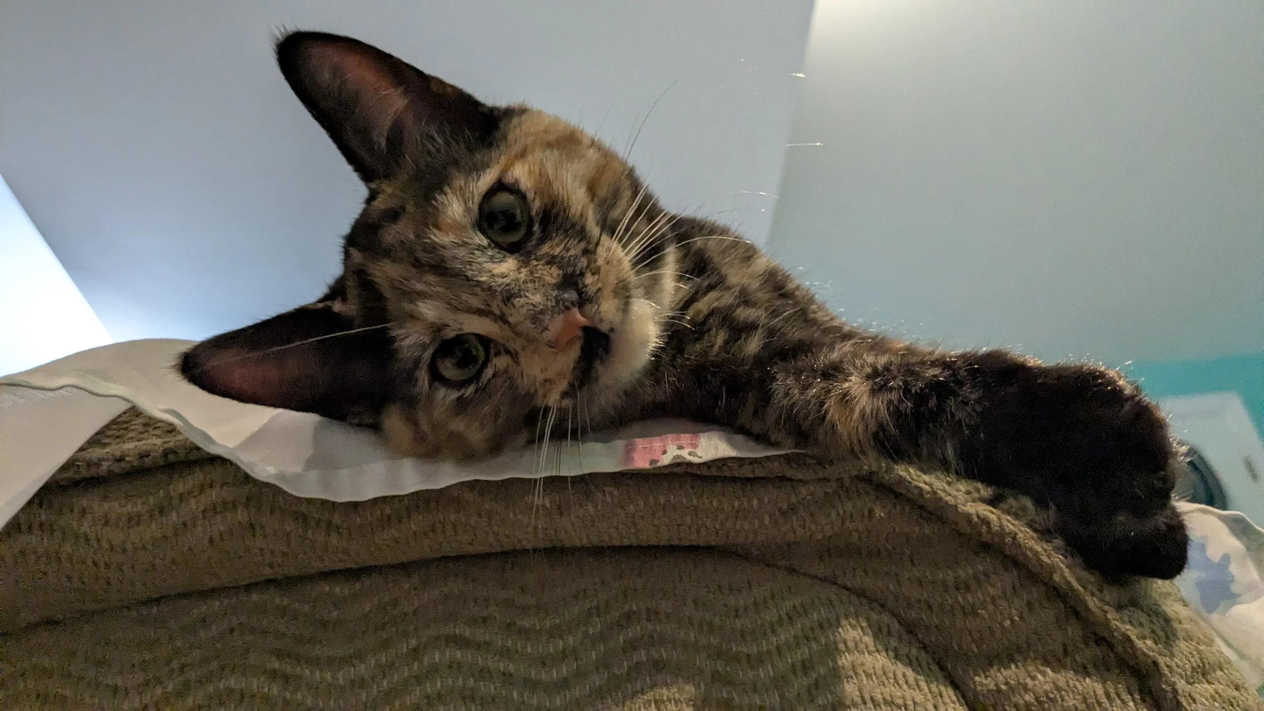 Cuora who is currently in a foster home was found crossing a backyard with her semi-feral mom, brother, and sister at just 2 months old. She is a tiny girl with a pink button-nose and a heart full of love! If you so much as look at her she’ll start purring. She is just as happy to soak up cuddles as she is to give chase and wrestle with her much bigger and rougher foster siblings. She would do best in a home with cats of any age, and a family ready to give her all the cuddles and kindness she deserves.