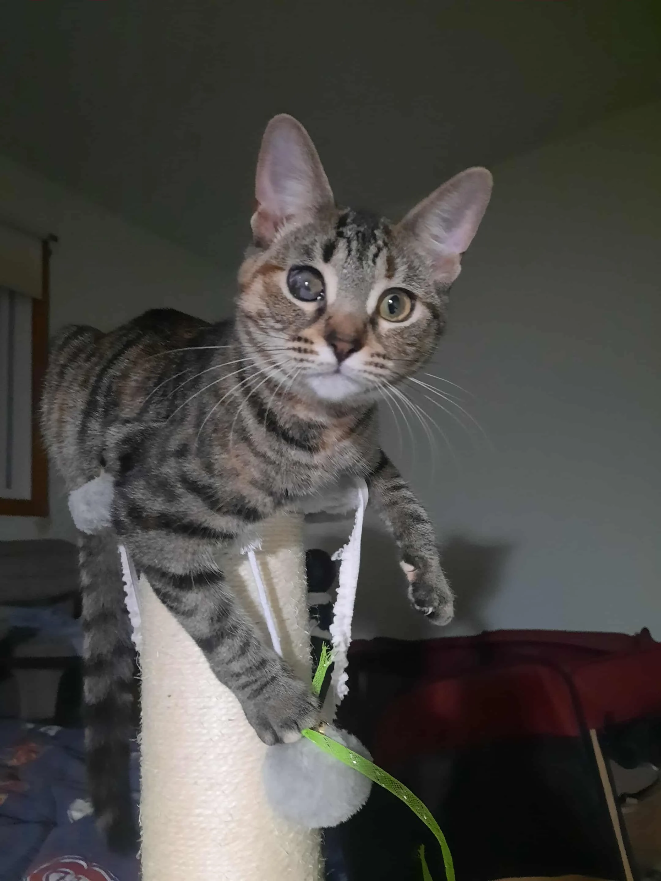 Eagle is FIV positive like her sister, Ellison. This little lady had a rough start. When she came to PCON with her feral mom she had an ulcer on her right eye. With medication the ulcer cleared up but left a damaged cloudy eye with partial vision. She is a sweet quiet kitty who loves to watch her siblings play and waits for your hand to be free for some scratches.