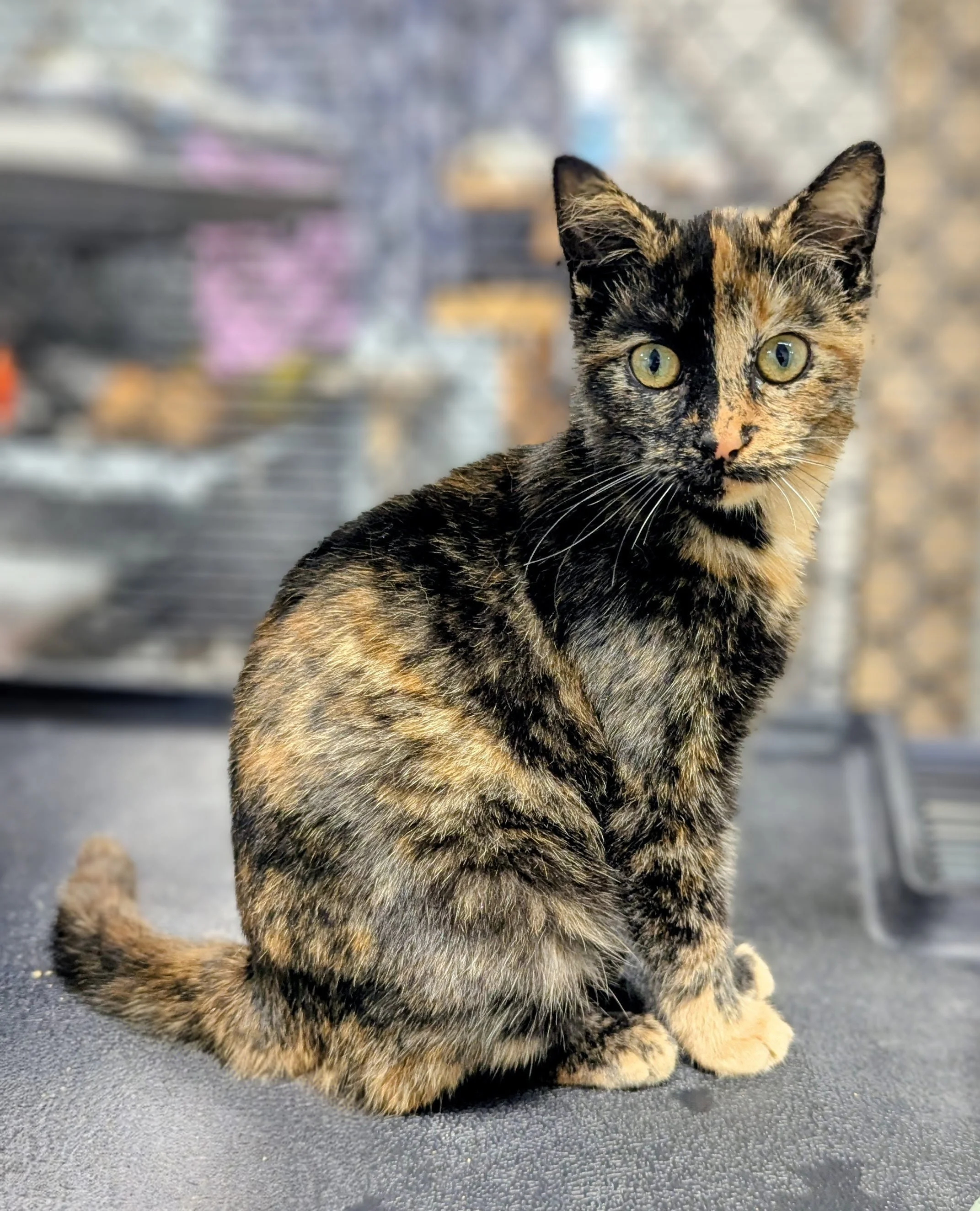 Jazel is a beautiful tortie kitten with a playful spirit and a loving heart. Jazel was rescued from a large outdoor colony and brought to our shelter for her vetting and care. Now healthy, safe, and full of life, she’s ready to find a forever home of her own. Jazel loves to play—whether it’s chasing toys, wrestling with a friend, or exploring new spaces. She enjoys the company of other kittens and would be thrilled to have a feline playmate in her new home. She also adores human attention and will happily seek out pets, cuddles, and time by your side. If you’re looking for a sweet, social, and fun-loving kitten, Jazel just might be the perfect match.