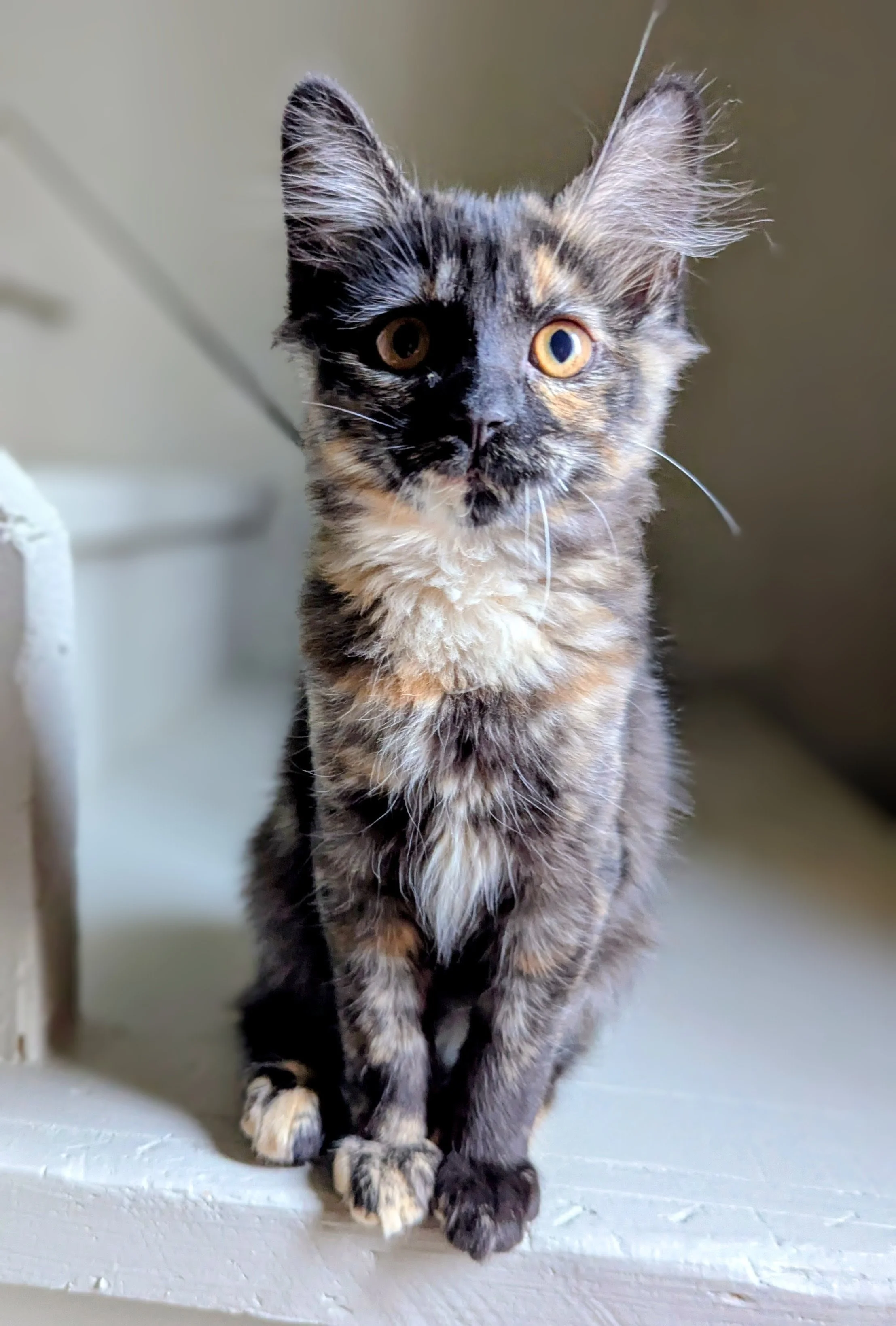 Laren is a sweet little tortie fluff ball born in our care and now ready for adoption. She loves playing with her sibling and goes especially crazy for wand toys. After playtime, she’s all snuggles—pick her up and she instantly becomes a warm, happy purring machine. She’ll make the perfect cuddly, playful companion.