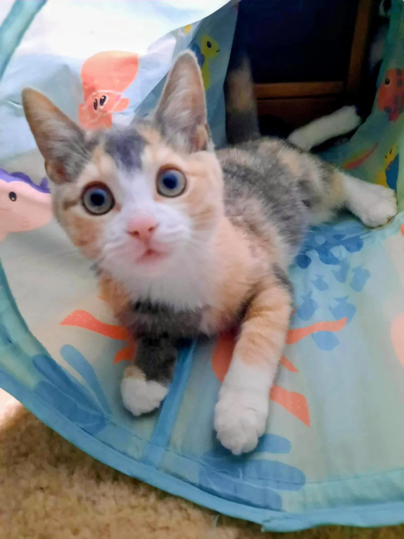 Lovie is a beautiful calico kitten currently being cared for in a loving foster home. Lovie is ready to find her forever family! This sweet girl has the loudest, happiest purr that starts the moment you come near her. She adores chasing toys on strings, wrestling playfully with her brother, and watching birds flutter outside the window. If you're looking for a gentle, playful, and affectionate companion, Lovie is ready to bring joy to your home.
