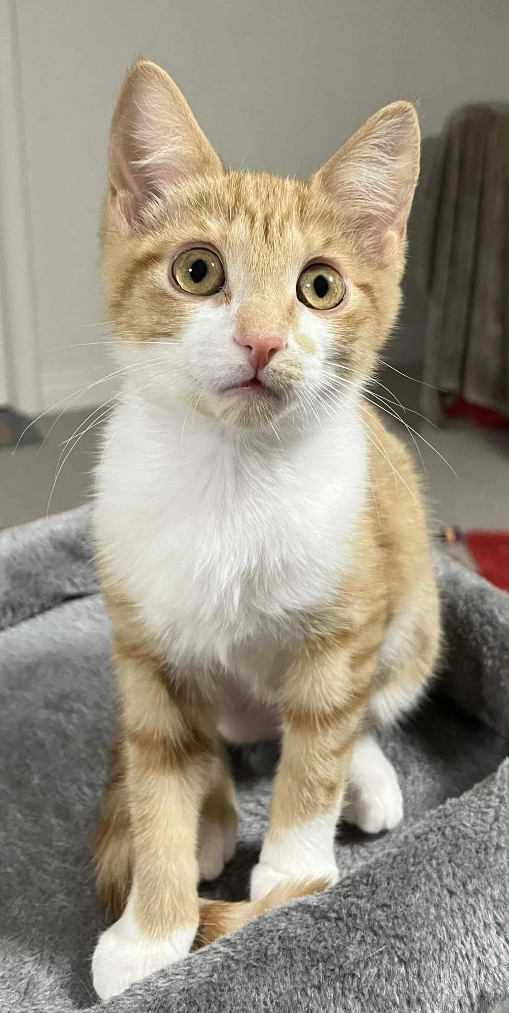 Penne is currently in a foster home. She is a cute bundle of energy and loves to play with her twin sister. The only thing telling them apart is one has a splotch on the left of her nose, and the other has a splotch on the right of her nose. Penne and Payne had been raised outside by their mother, Pheeona. She kept them safe until they were found by humans who took them to Purrfect Companions. Penne absolutely adores playing with toys and other kittens. They don’t have much time for cuddles, yet. Penne would enjoy going home with her sister, another foster cat, or meeting a new furry friend in your home.
