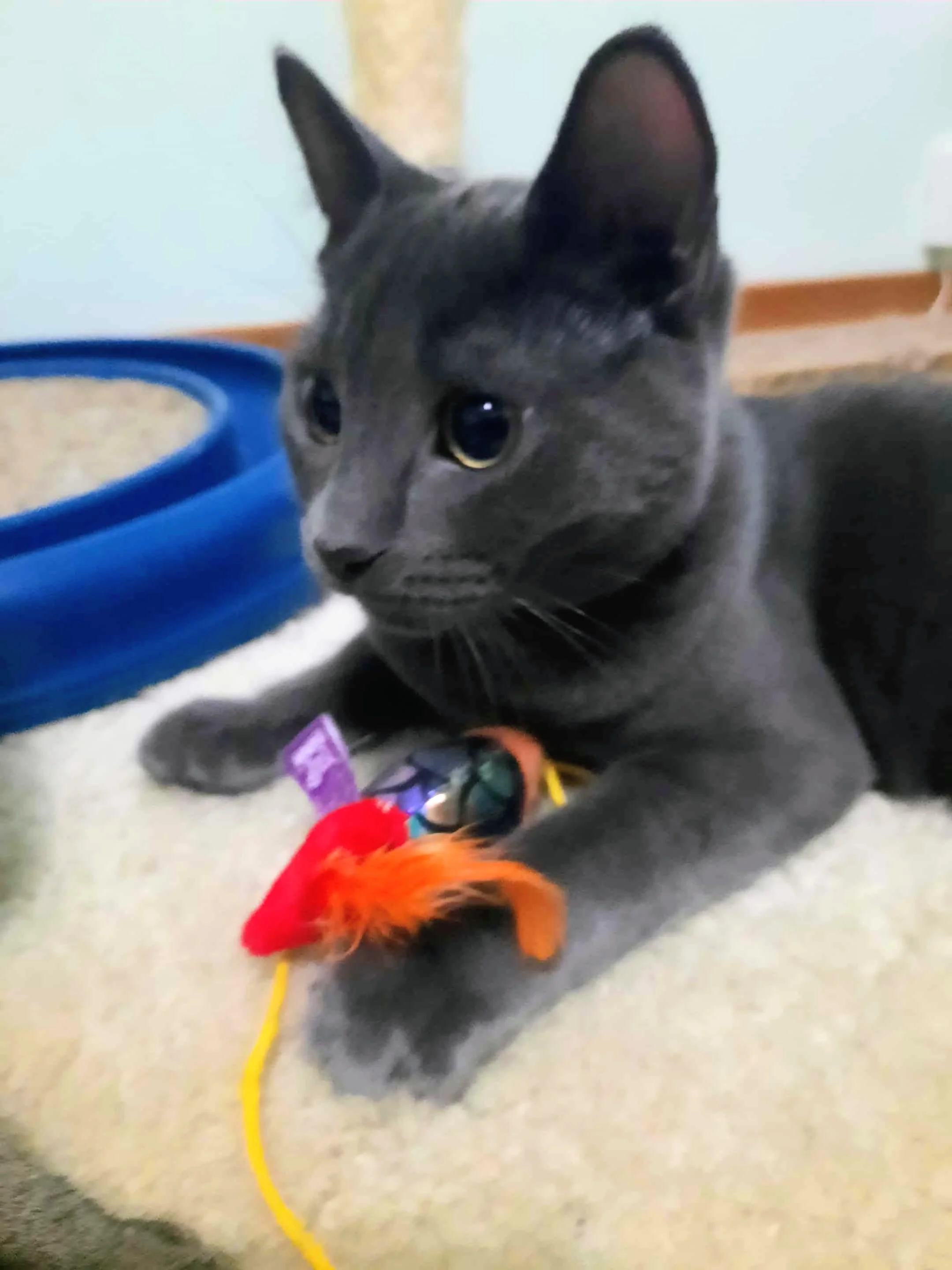This beautiful handsome boy is loving and sweet. He enjoys chasing laser lights, toys on strings and crinkle balls. He will jump so high to swat those crinkle balls. He is happy to be held and loves head scratches.