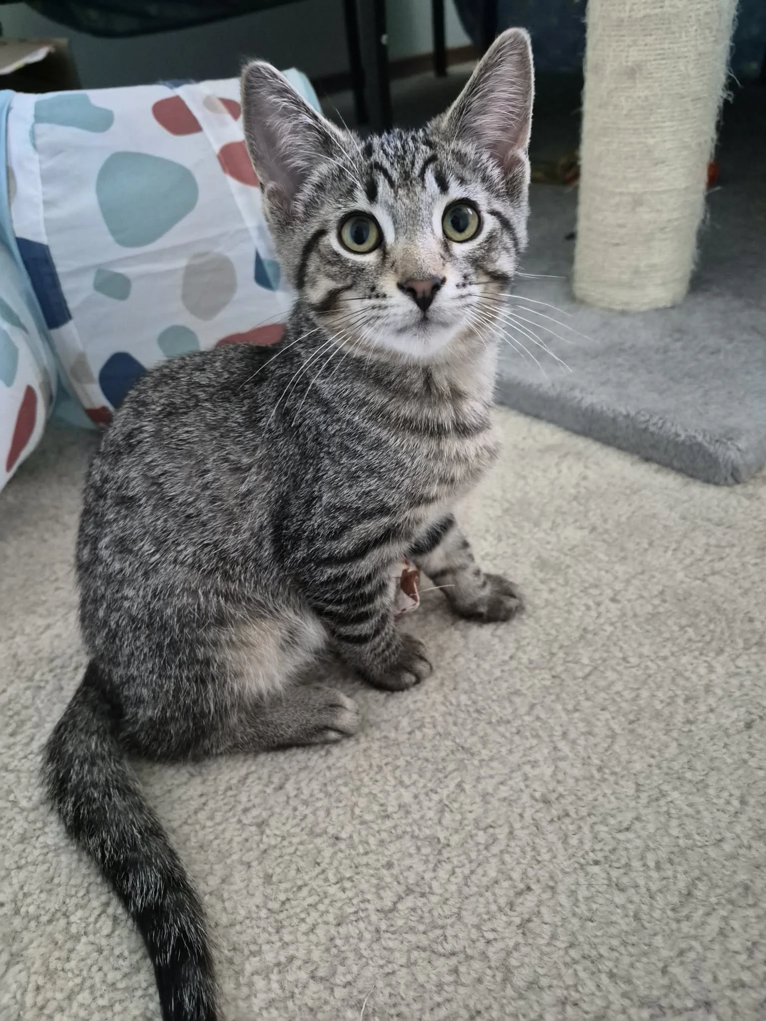 Fonso is a sweet tabby kitten who has come a long way since his shy beginnings. As the most timid of his six-kitten litter, he initially preferred to observe from a safe distance, but with time, he’s blossomed into a more outgoing and curious little guy. Every day, he grows bolder, always eager to explore new things and find fun ways to engage. Fonso absolutely loves chasing the laser light and batting at string toys, his playful energy filling the room. But after a good play session, he’s always ready to wind down and find a cozy spot on your lap, where he can relax and soak up all the love. His journey from shy to social makes Fonso all the more special, and his affectionate nature is sure to capture your heart.