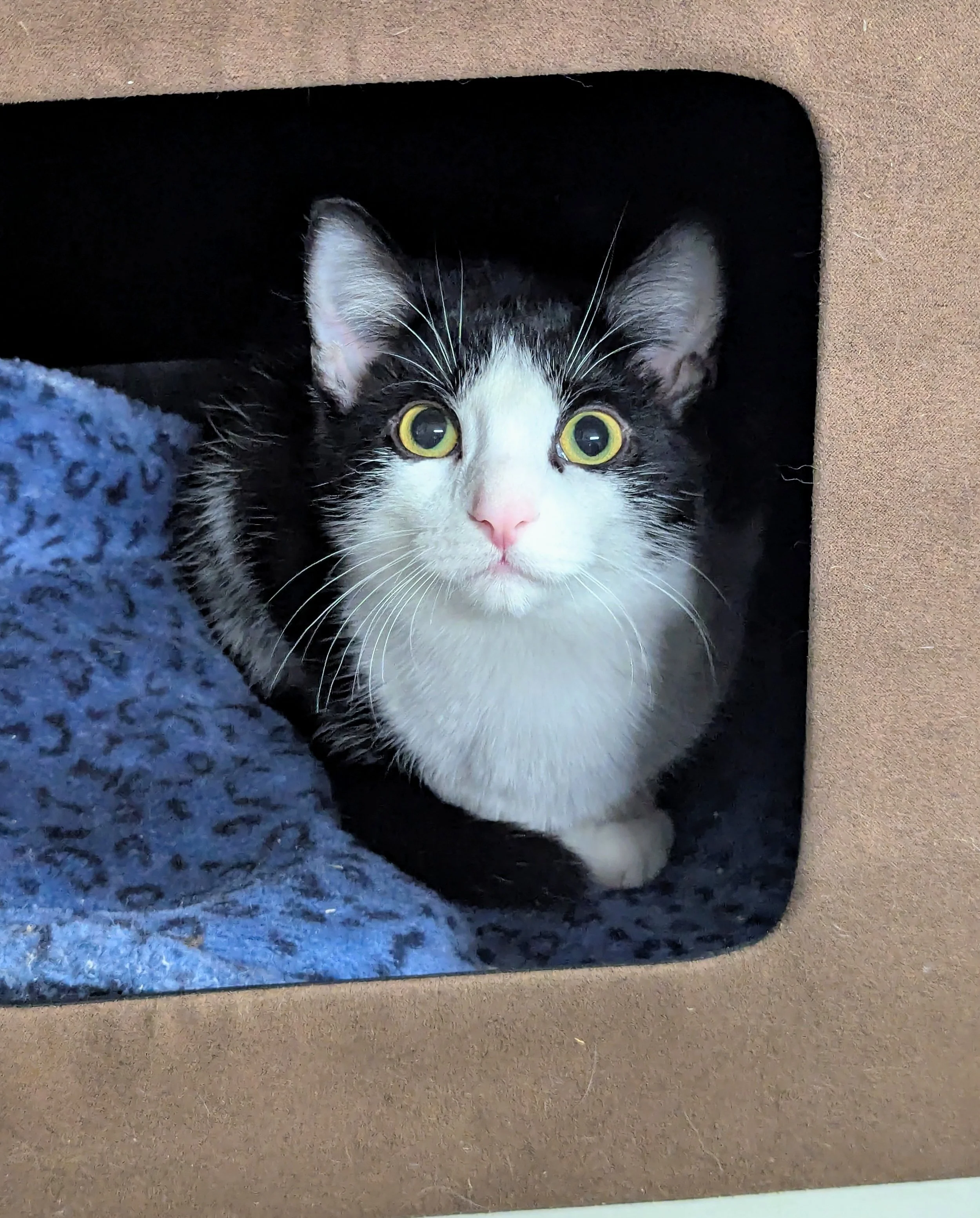 Gaddi and his brothers, Garrick and Gallio, were found outside struggling to survive with their mom. After some nurturing time in foster care, they’re now at the shelter waiting for their forever families. Gaddi is the shy observer of the trio, preferring to watch his brothers play. Gaddi loves wand toys and treats. He’ll do best adopted with one of them or into a home with another friendly feline.