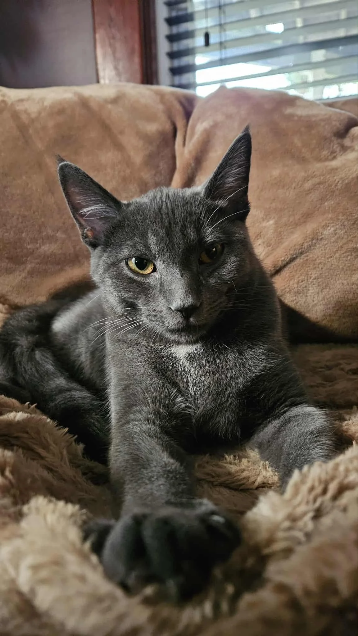 Jorland is a handsome grey boy with a big heart and an even bigger personality once he feels at home. A little shy at first, he just needs a bit of patience and reassurance to come out of his shell — but when he does, his playful, curious nature takes over. He loves chasing toys, hanging out with other cats, and pouncing around during playtime. Jorland’s a social boy who truly enjoys the company of other cats and would do best in a home with a feline friend. With a calm, slow introduction, he would likely do well with a gentle dog, too. He’s affectionate, gentle, and full of kitten mischief. His new family will be rewarded with endless love, fun, and the sweetest little companion.