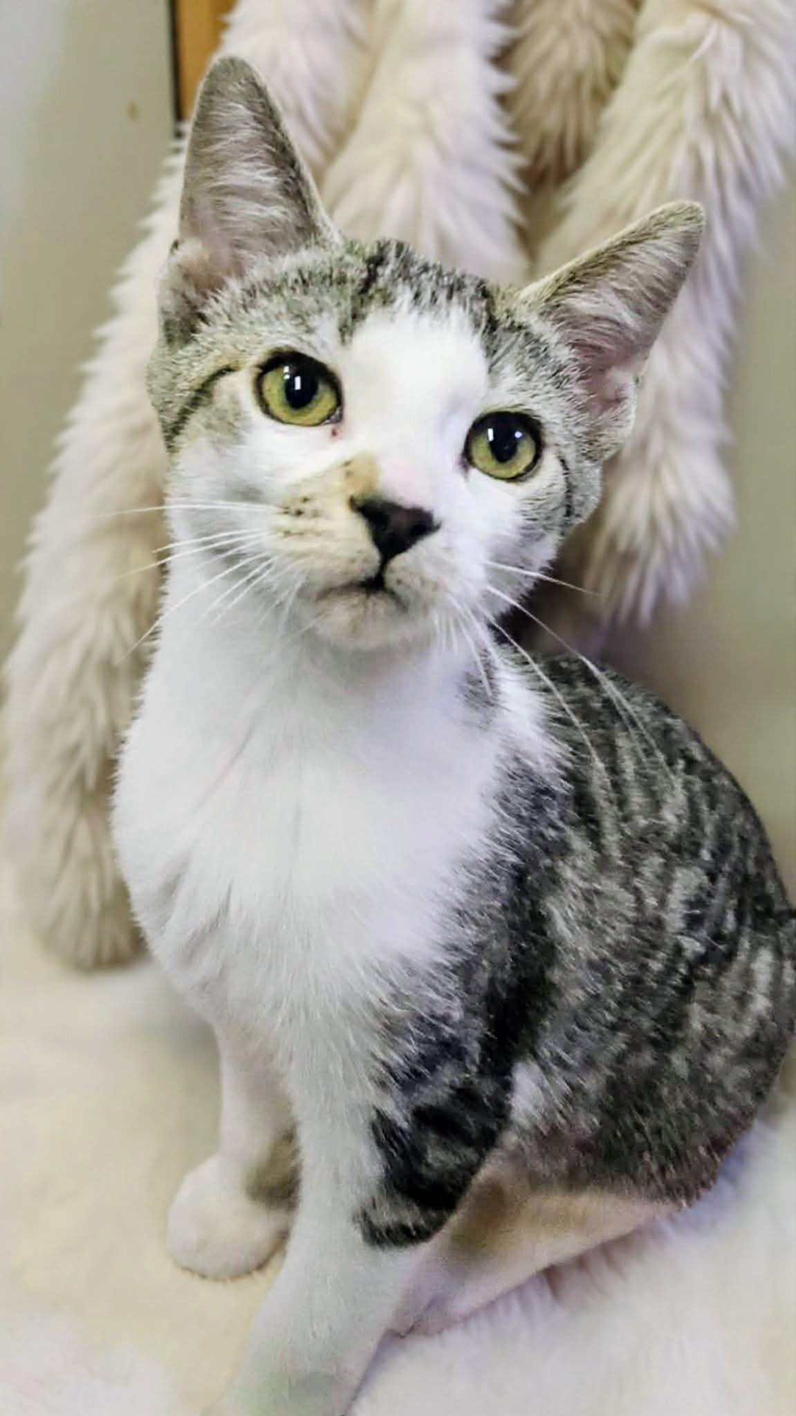This playful little guy is full of curiosity, mischief, and energy. Lyndel loves racing through his tunnel toy, leaping over his cat tree, and exploring every corner of his world. He's always on the move and happiest when he has space to play, climb, and investigate. After all that adventure, Lyndel enjoys relaxing nearby, keeping you company and purring softly — on his terms. While he isn't a fan of being picked up or held right now, he shows affection by choosing to be close and engaging through play and interaction. With time, trust, and respect for his boundaries, he may continue to grow more comfortable. He would do best with a playful companion—maybe one of his siblings (Logann, Loribelle, Lancaster or Lottee)—to help burn energy and build confidence. Lyndel goes crazy for Churu and Temptations treats, which makes bonding and positive interactions extra fun. He's looking for a forever home that understands kitten personalities, enjoys interactive play, and lets affection develop naturally.
